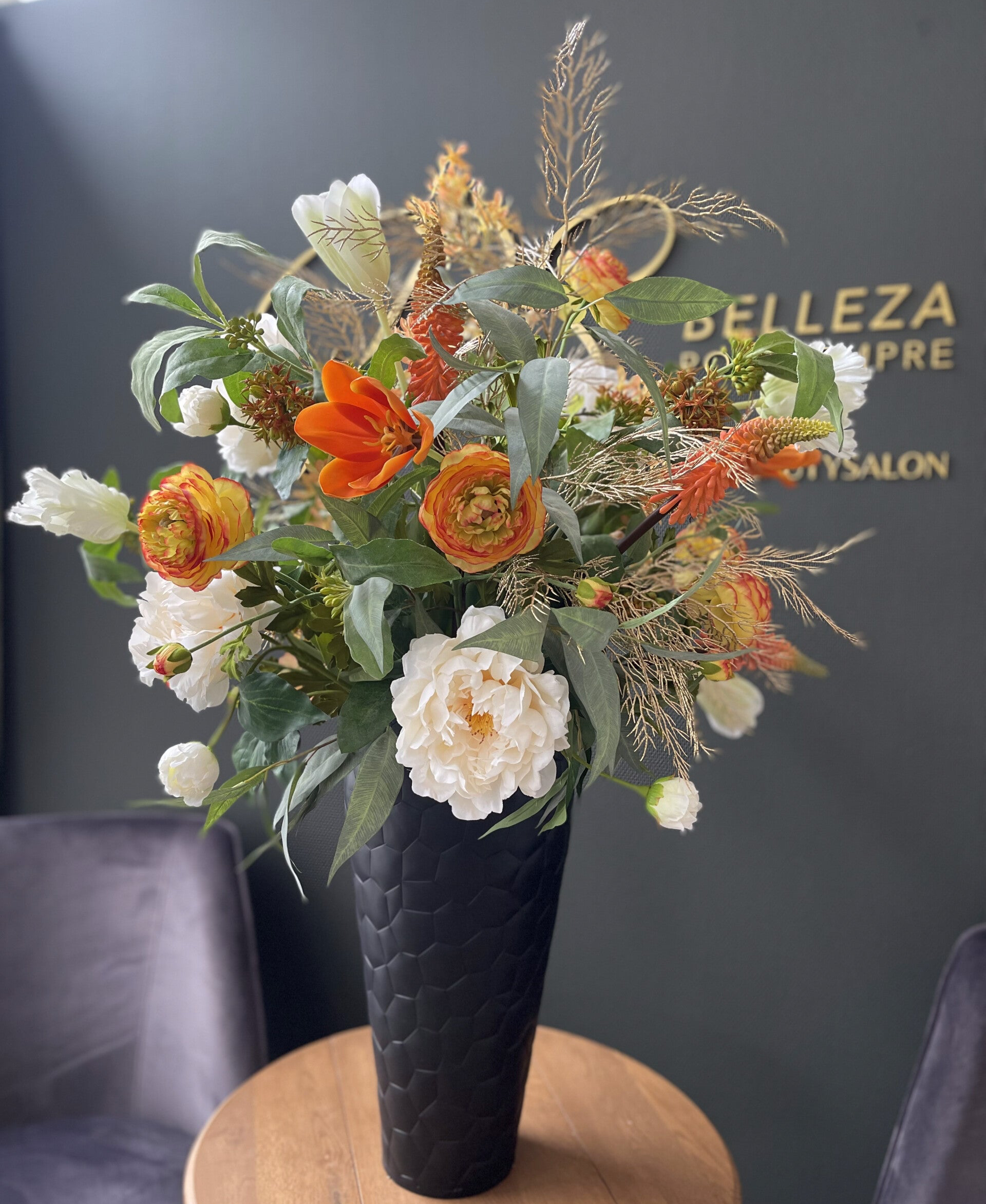 Prachtig opgemaakt boeket in oranje en creme tinten. Het relief van de pot lijkt op het relief van een voetbal.